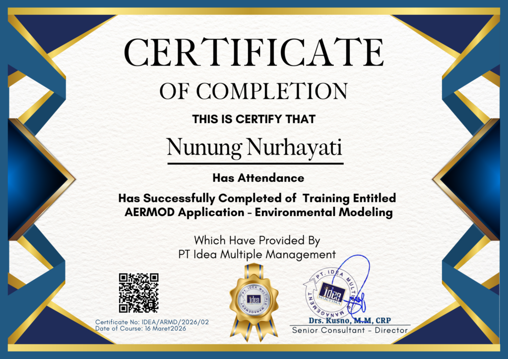NUNUNG NURHAYATI Status sertifikat : VALID Topik sertifikat : AERMOD Application – Enviromental ModelingNomor sertifikat : IDEA/ARMD/2026/02Tanggal efektif : 16 Maret 2026Berlaku hingga : 15 Maret 2036
