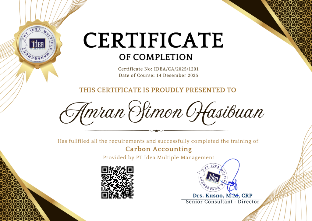 AMRAN SIMON HASIBUAN Status sertifikat : VALID Topik sertifikat : Carbon AccountingNomor sertifikat : IDEA/CA/2025/1201Tanggal efektif : 14 Desember 2025Berlaku hingga : 13 Desember 2035