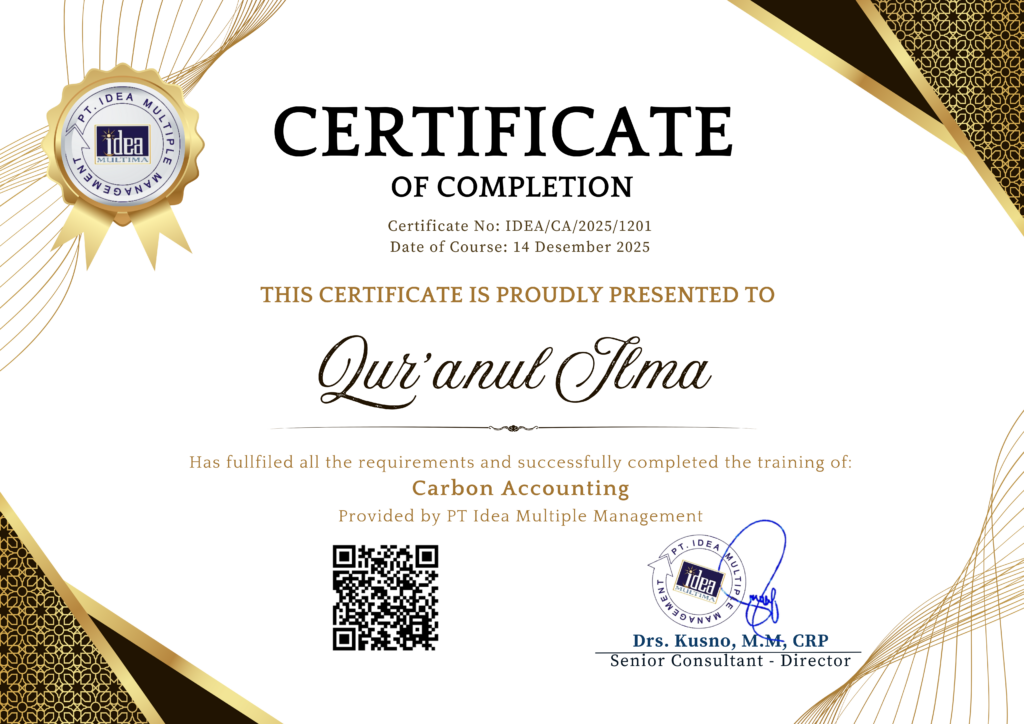 QUR'ANUL ILMA Status sertifikat : VALID Topik sertifikat : Carbon AccountingNomor sertifikat : IDEA/CA/2025/1201Tanggal efektif : 14 Desember 2025Berlaku hingga : 11 Desember 2035