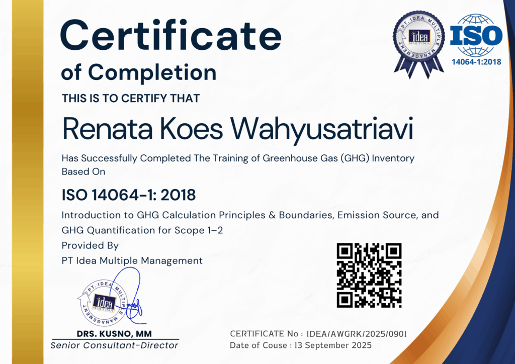 RENATA KOES WAHYUSATRIAVI Status sertifikat : VALID Topik sertifikat : Greenhouse Gas (GHG) Inventory Based on ISO 14064-1: 2018Nomor sertifikat : IDEA/AWGRK/2025/0901Tanggal efektif : 13 September 2025Berlaku hingga : 13 September 2035