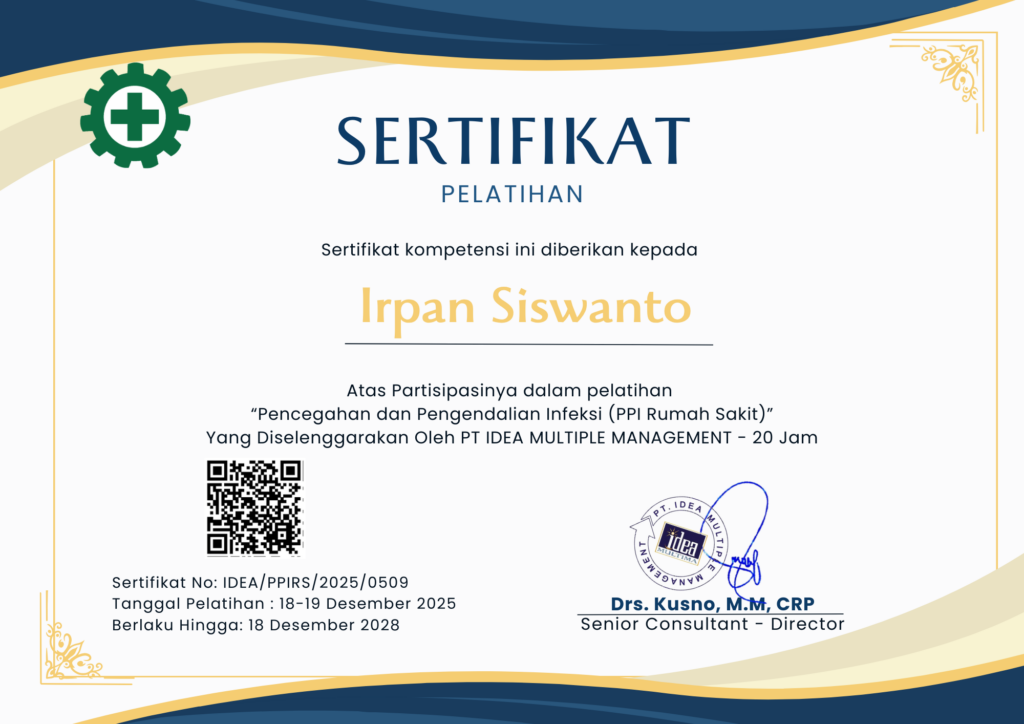Irpan Siswanto Status sertifikat : VALID Topik sertifikat : Pelatihan “Pencegahan dan Pengendalian Infeksi (PPI Rumah Sakit)” – 20 JamNomor sertifikat : IDEA/PPIRS/2025/0509Tanggal efektif : 19 Desember 2025Berlaku hingga : 18 Desember 2028