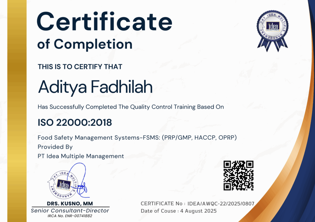 ADITYA FADHILAH Status sertifikat : VALID Topik sertifikat : Food Safety Management Systems-FSMS:(PRG/GMP,HACCP, OPRP)Nomor sertifikat : IDEA/AWQC-22/2025/0807Tanggal efektif : O4 Agustus 2025Berlaku hingga : 04 Agustus 2035