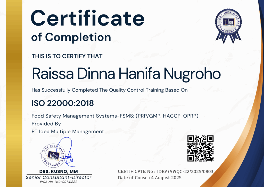 RAISSA DINNA HANIFA NUGROHO Status sertifikat : VALID Topik sertifikat : Food Safety Management Systems-FSMS:(PRG/GMP,HACCP, OPRP)Nomor sertifikat : IDEA/AWQC-22/2025/0803Tanggal efektif : O4 Agustus 2025Berlaku hingga : 04 Agustus 2035