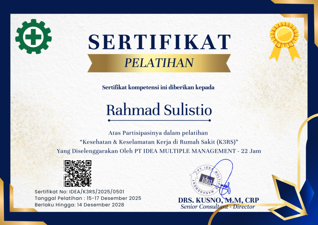 Topik sertifikat : Pelatihan“Kesehatan & Keselamatan Kerja di Rumah Sakit (K3RS)” – 22 Jam