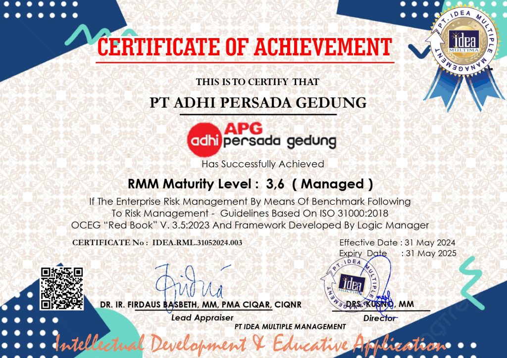 PT ADHI PERSADA GEDUNG Certificate status : VALIDCertificate Topic : RMM Maturity Level : 3,6 ( Managed ) Certificate No : IDEA.RML.31052024.003 Effective Date : 31 May 2024 Valid Until : 31 May 2025