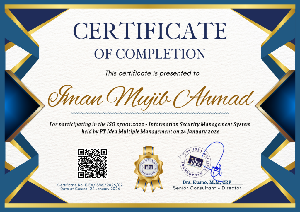 IMAM MUJIB AHMAD Status sertifikat : VALID Topik sertifikat : Information Security Management System Based on ISO 27001:2022Nomor sertifikat : IDEA/ISMS/2026/02Tanggal efektif : 24 Januari 2026Berlaku hingga : 22 Januari 2035