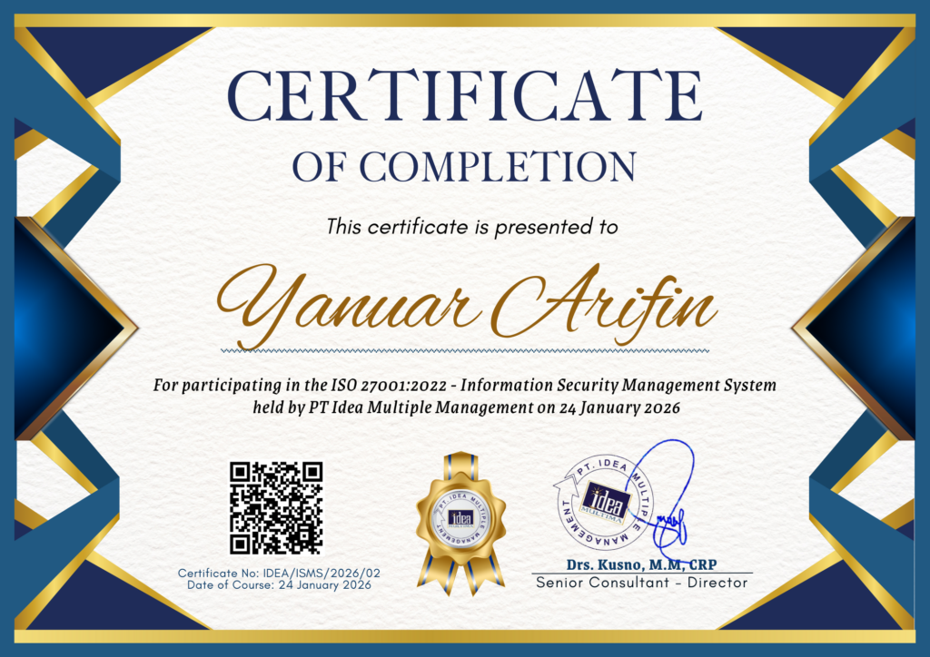 YANUAR ARIFIN Status sertifikat : VALID Topik sertifikat : Information Security Management System Based on ISO 27001:2022Nomor sertifikat : IDEA/ISMS/2026/02Tanggal efektif : 24 Januari 2026Berlaku hingga : 22 Januari 2035