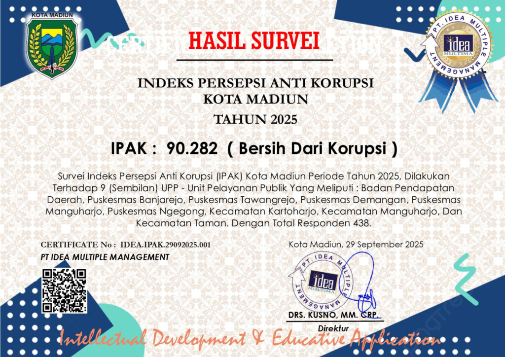 SURVEI INDEKS PERSEPSI ANTI KORUPSI KOTA MADIUN Certificate Status : VALIDSurvey Result : IPAK : 90.282 (Bersih Dari Korupsi)Certificate No : IDEA.IPAK.29092025.001Effective Date : 29 Sept 2025Valid Until : 29 Sept 2026